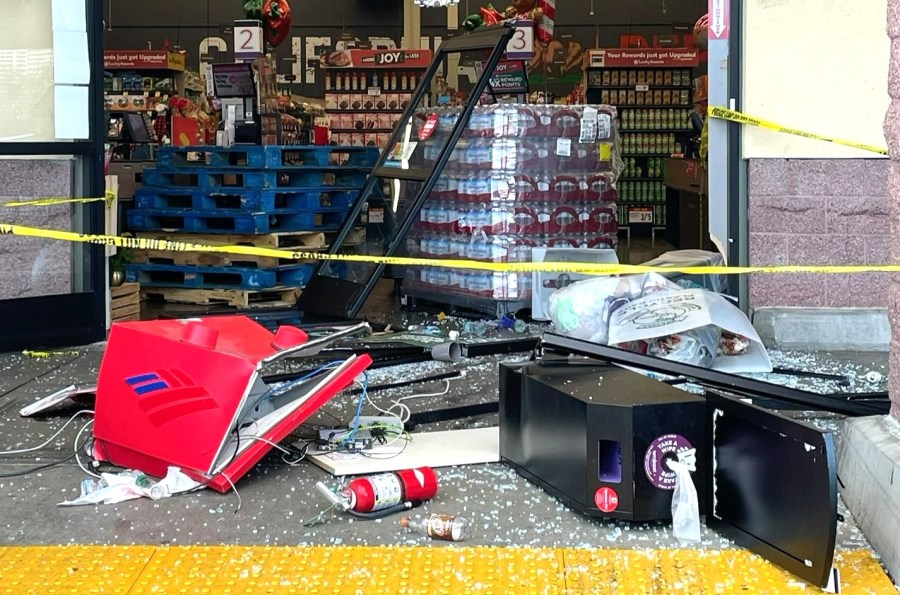 UPDATE: A brazen attempt to steal an ATM from a supermarket in Oakland has just been thwarted. On December 25, 2023, at approximately 7:30 a.m., a group of masked burglars crashed a truck through the front doors of the Lucky supermarket located at 247 18th Street, causing significant damage but ultimately failing to make off with the cash machine.